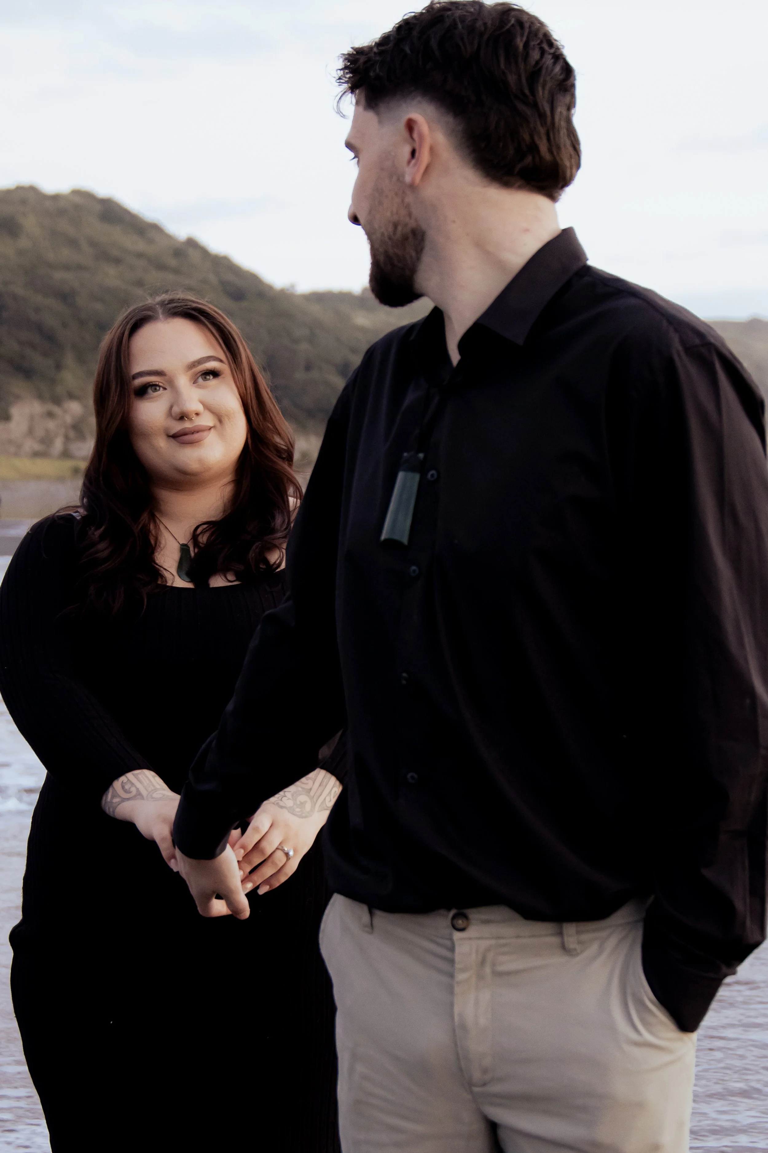 A couple standing outdoors, holding hands and looking at each other, with a natural landscape and water in the background.