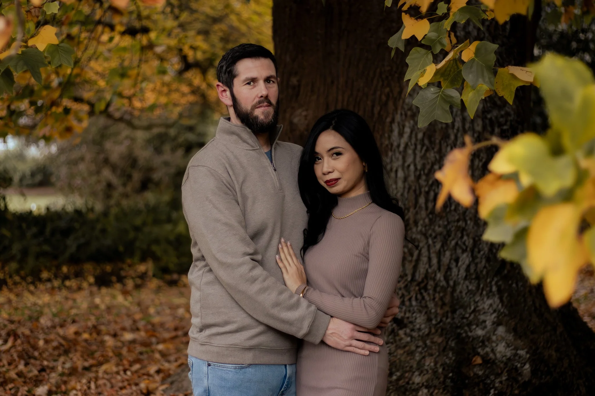 A man and woman standing close together in front of a large tree with yellow and green leaves, embracing outdoors during autumn.