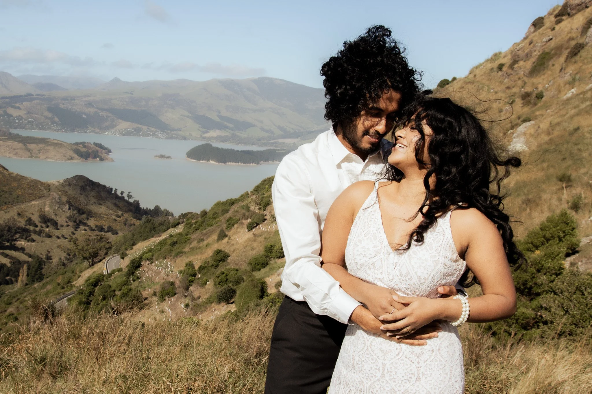 A woman and a man embracing outdoors, woman with short black hair and a white lace dress, man with curly dark hair and white shirt, hillside background.