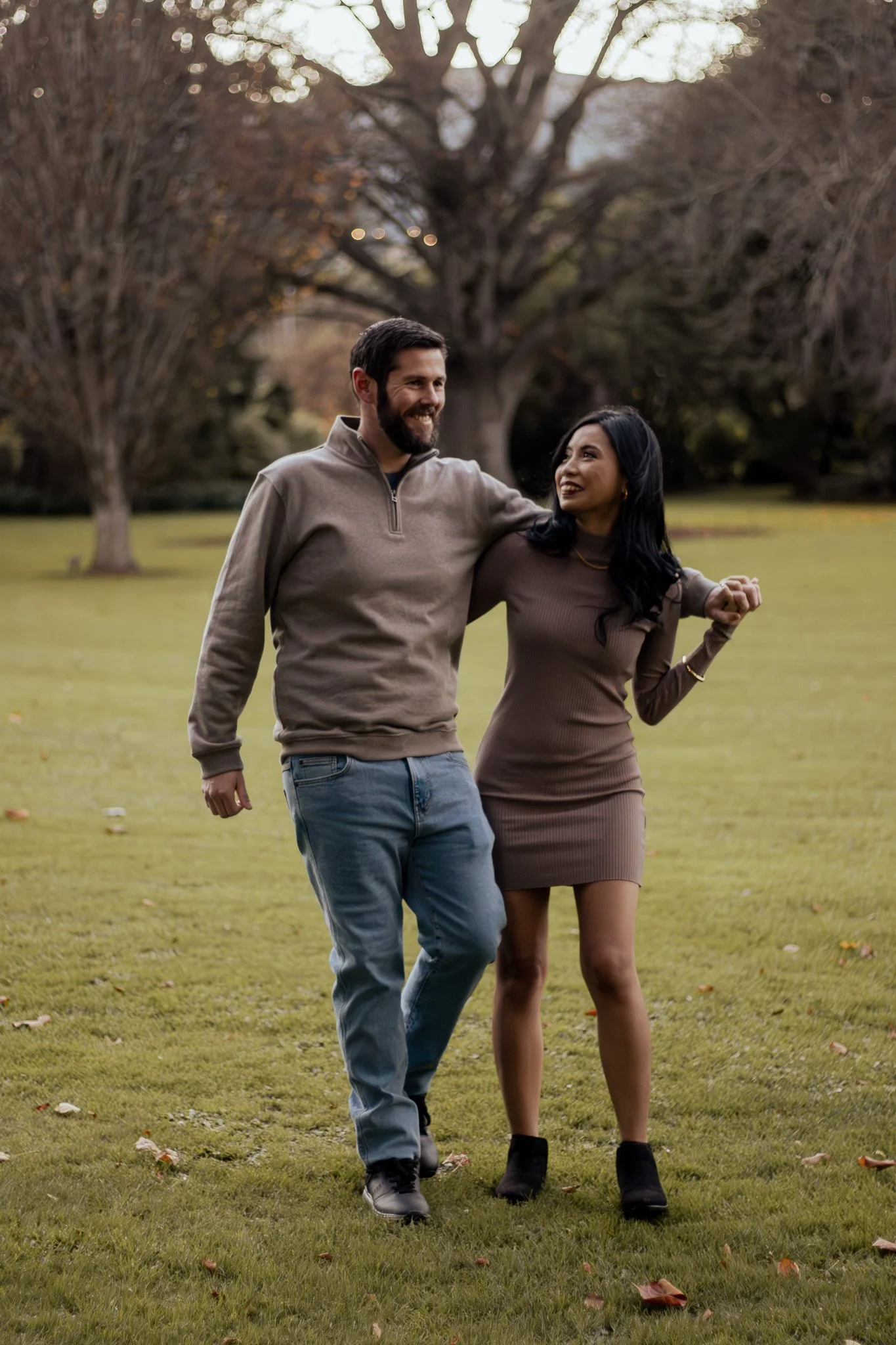 A man and woman walking in a park, smiling, with trees in the background.
