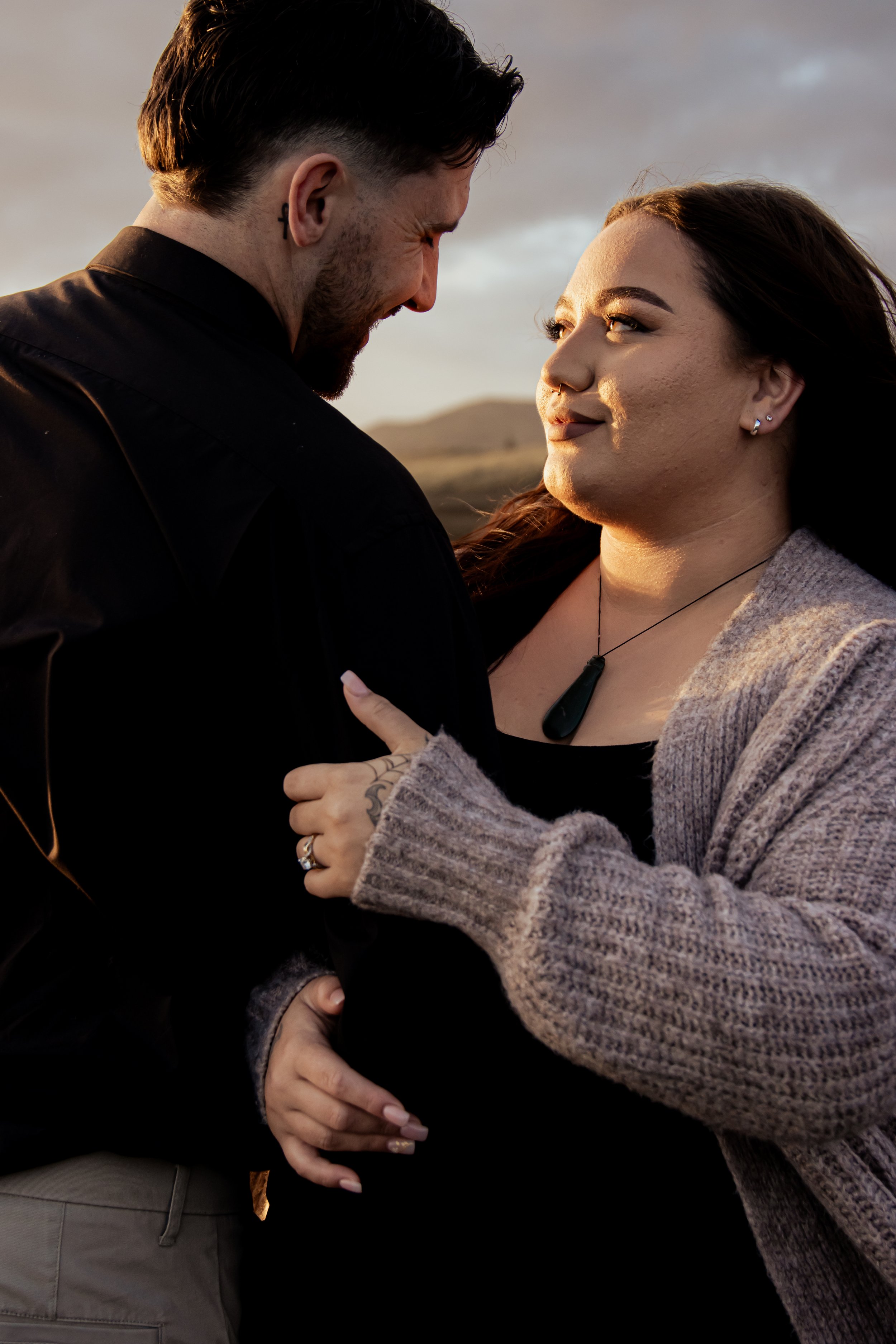 A couple embracing, with the woman showing an engagement ring and wearing a gray knitted sweater at Muriwai Beach
