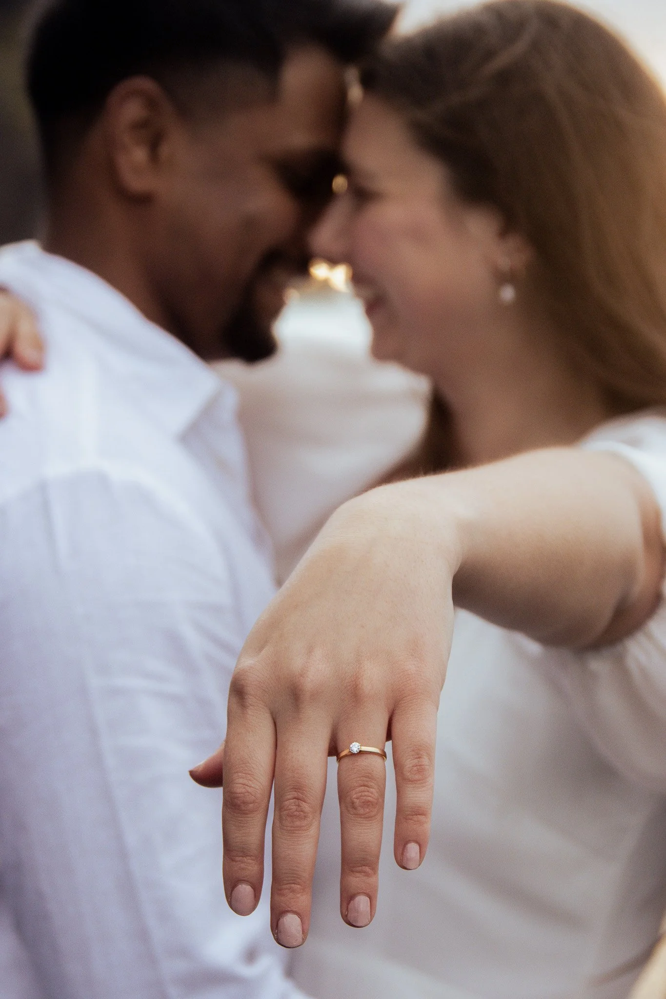 A couple embracing on a beach, with their foreheads touching. The woman is wearing a ring on her left hand.